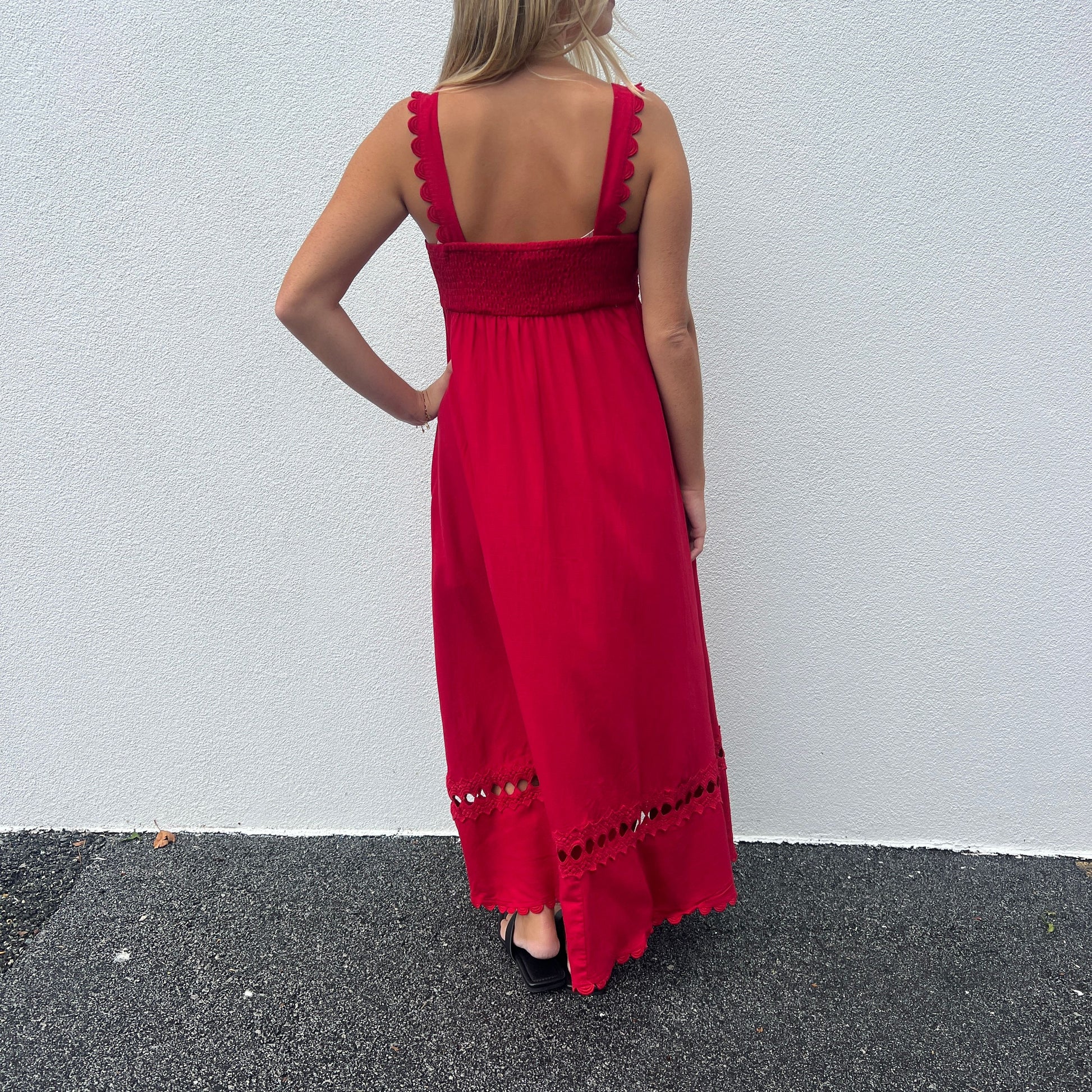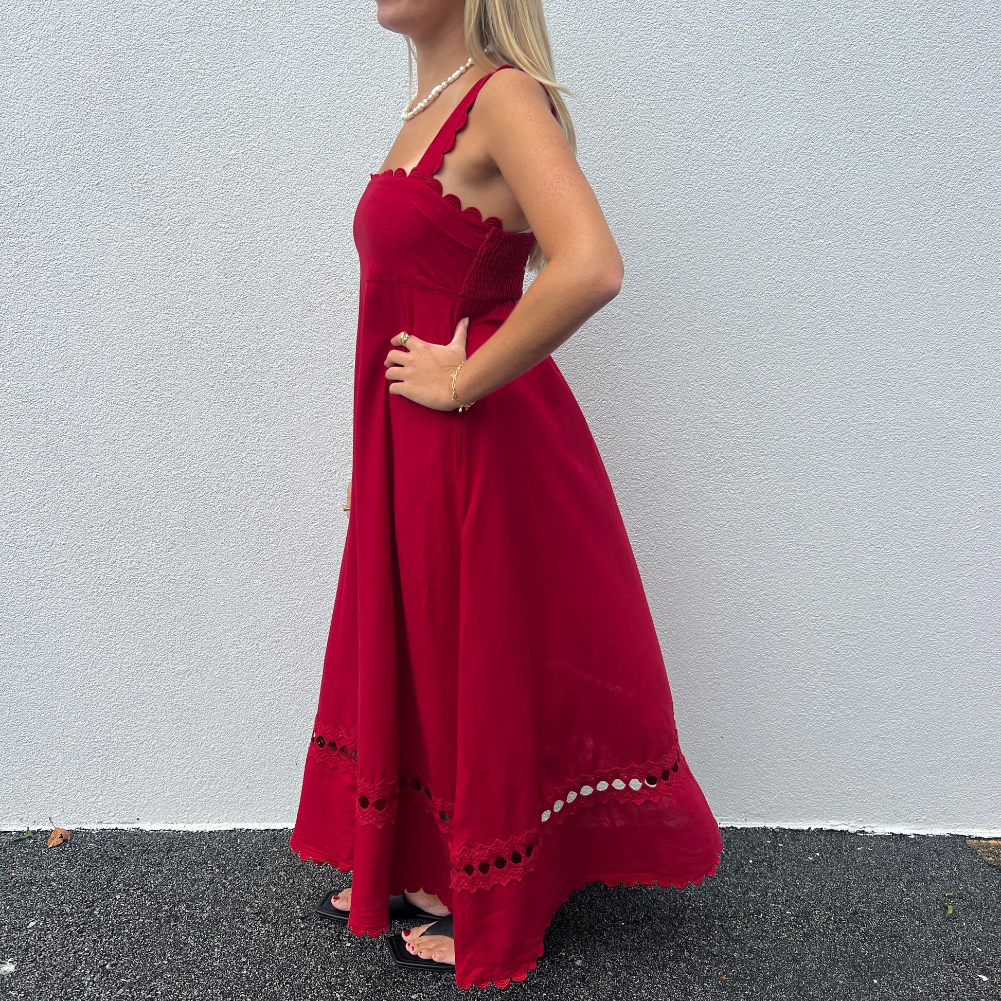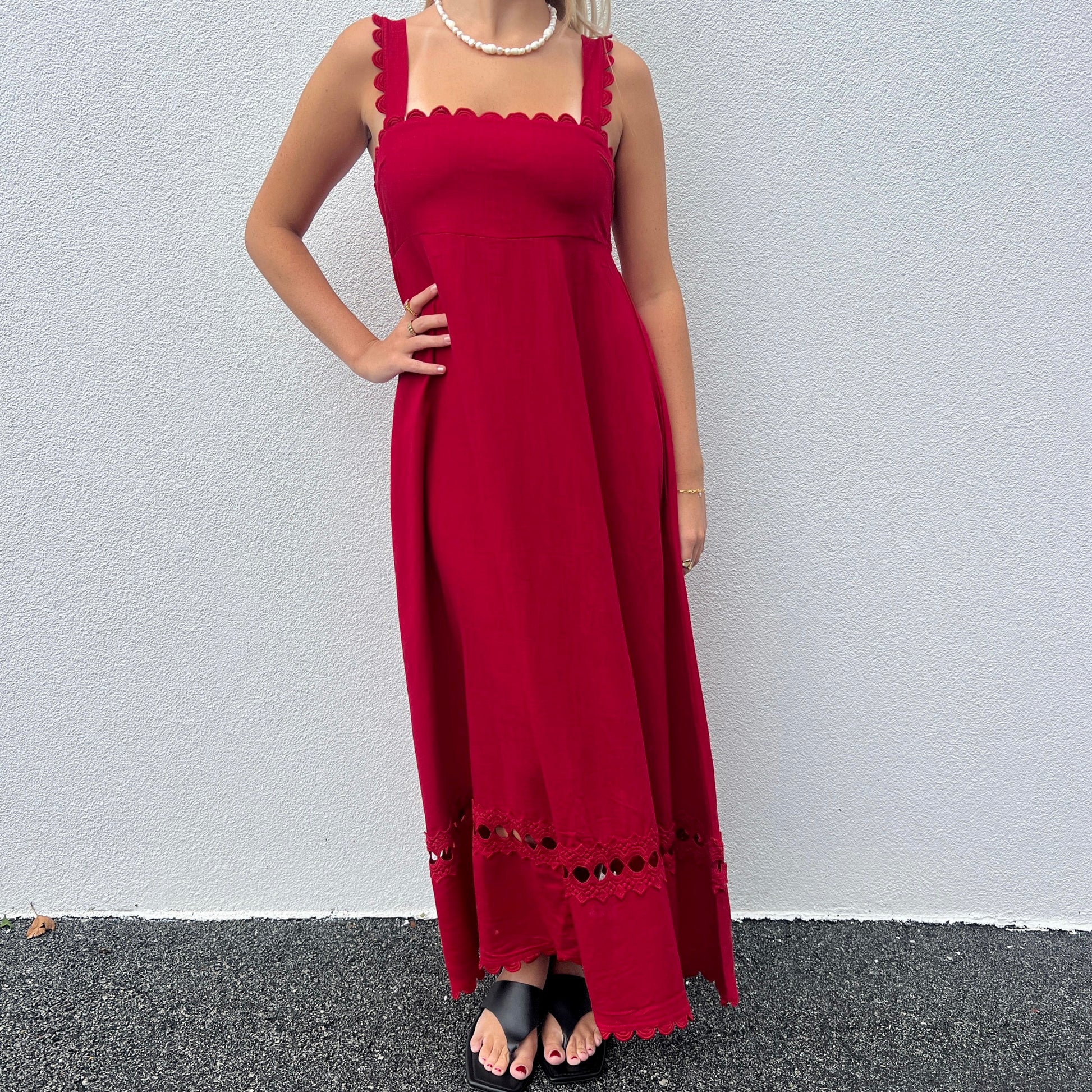 Featuring a flattering square neckline with delicate scalloped straps and a flowing A-line silhouette. The eyelet hem detailing adds a touch of charm and movement, perfect for summer days or sunset dinners.