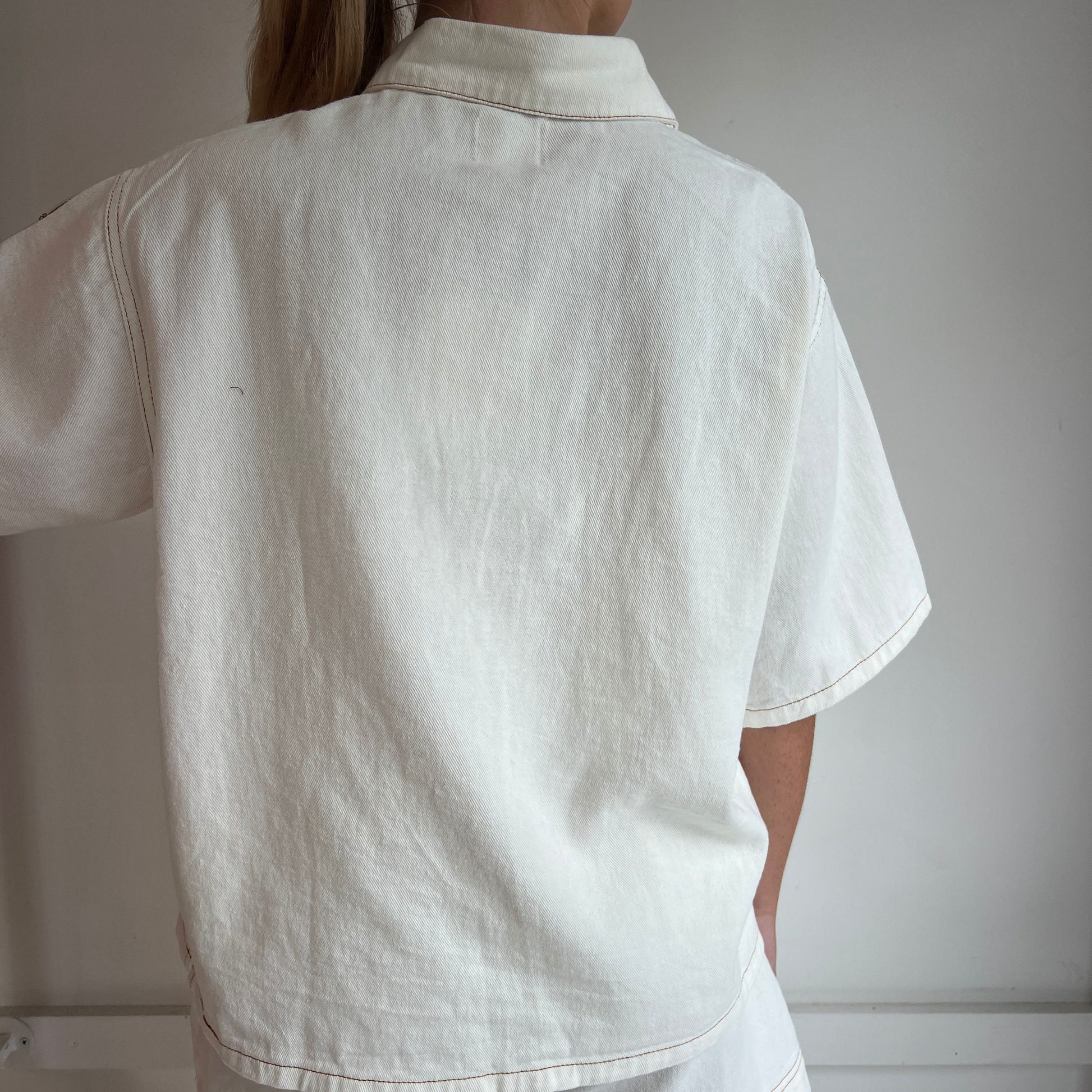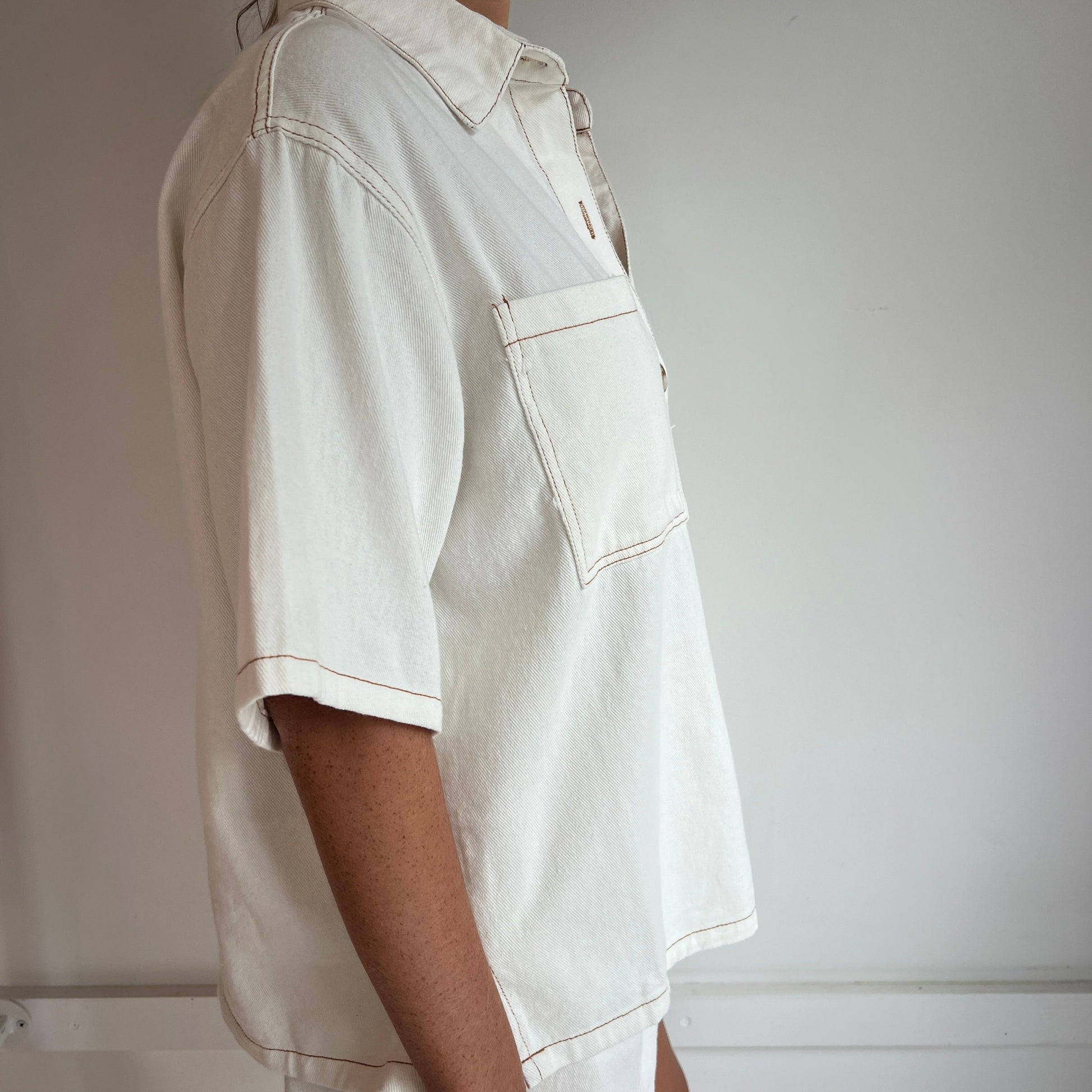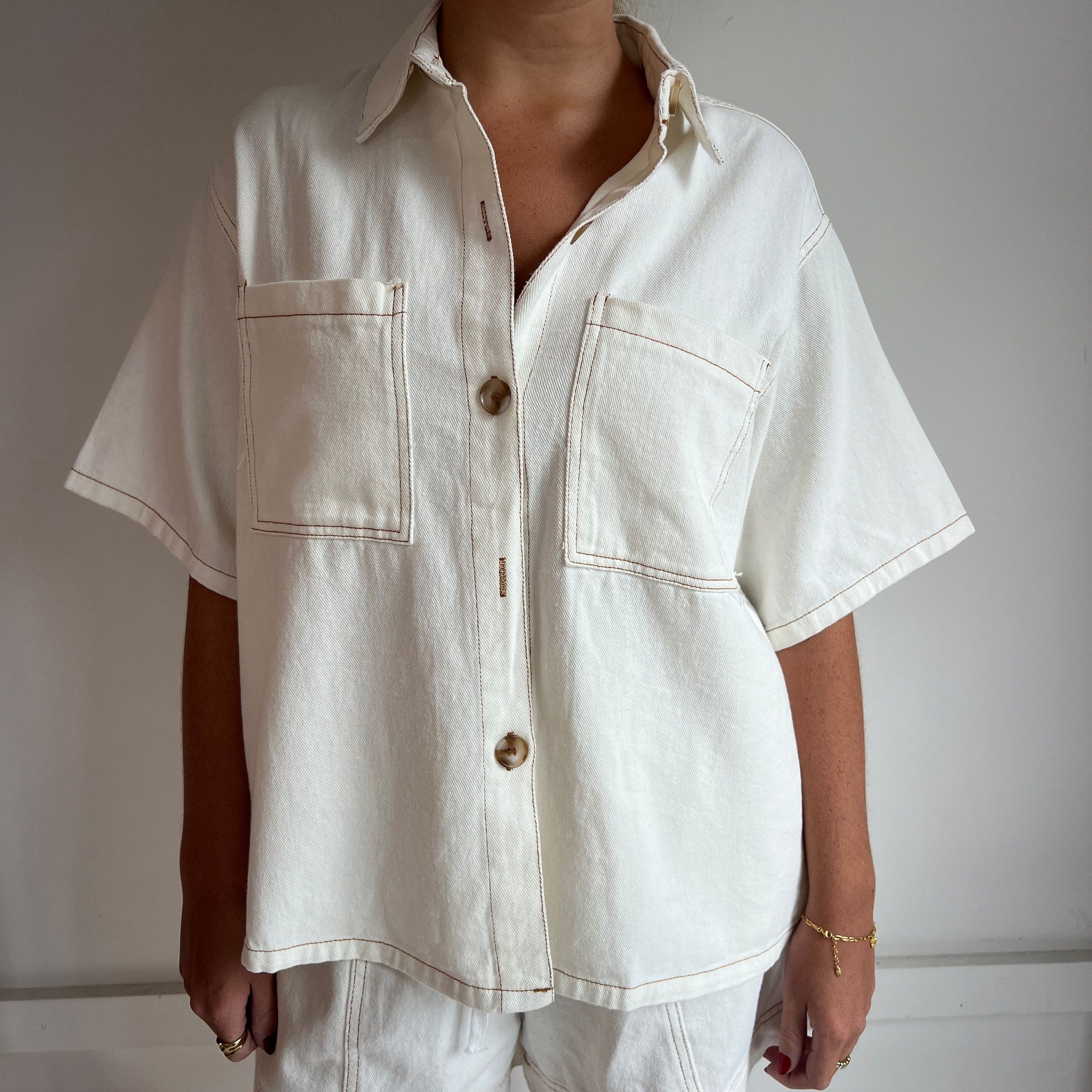 This By frankie white top is made from 100% Cotton and has a soft denim feel. This top features 5 buttons going down the centre, a collar and two pockets on either side at the front. This top looks great in a set with the matching shorts, or on its own with some cute jeans.