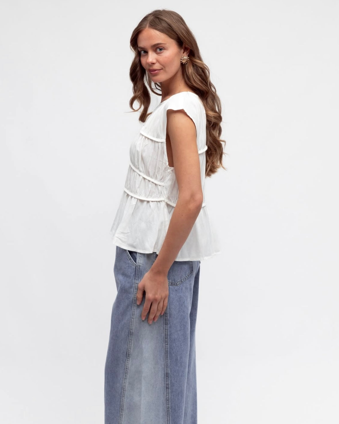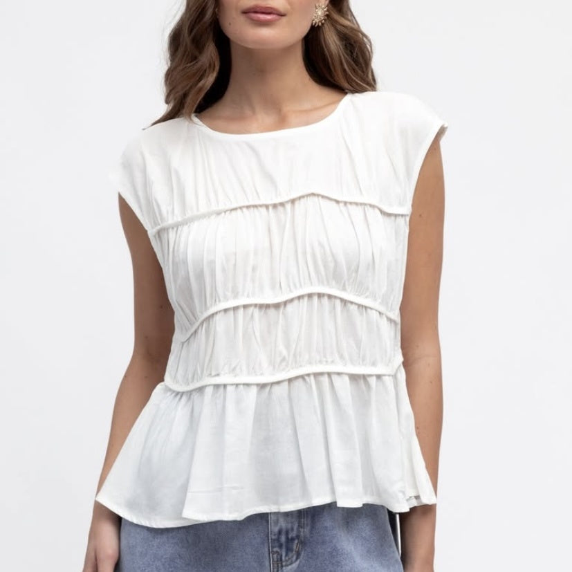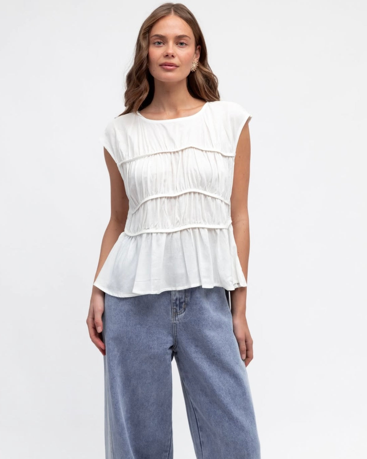 Effortless and feminine, this tiered blouse is a fresh take on a wardrobe essential. Crafted from lightweight, rayon/linen fabrication, it features delicate horizontal ruffle detailing and a soft flowy hemline for a flattering silhouette. The sleeveless cut keeps it versatile, perfect for warm days or layering under a jacket.