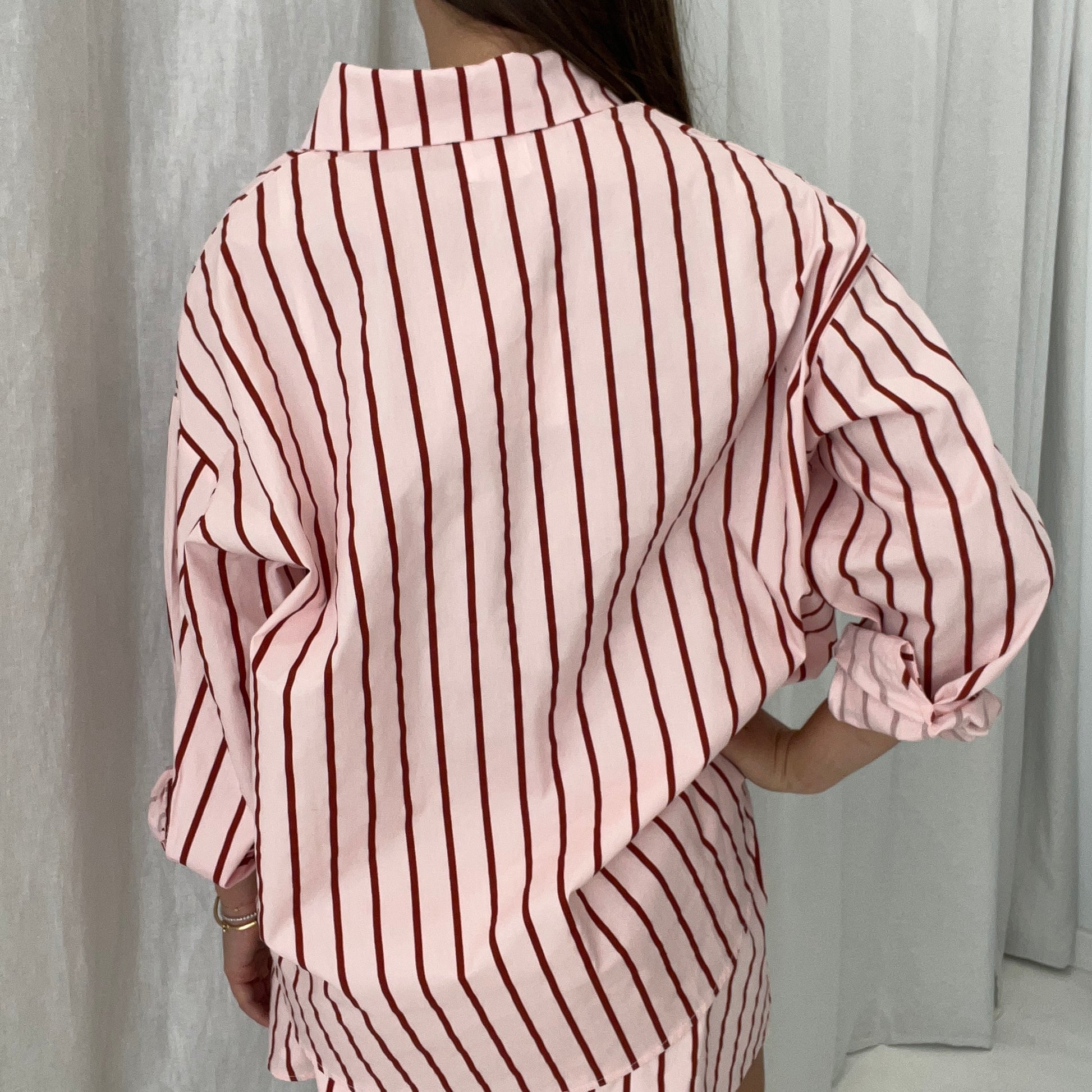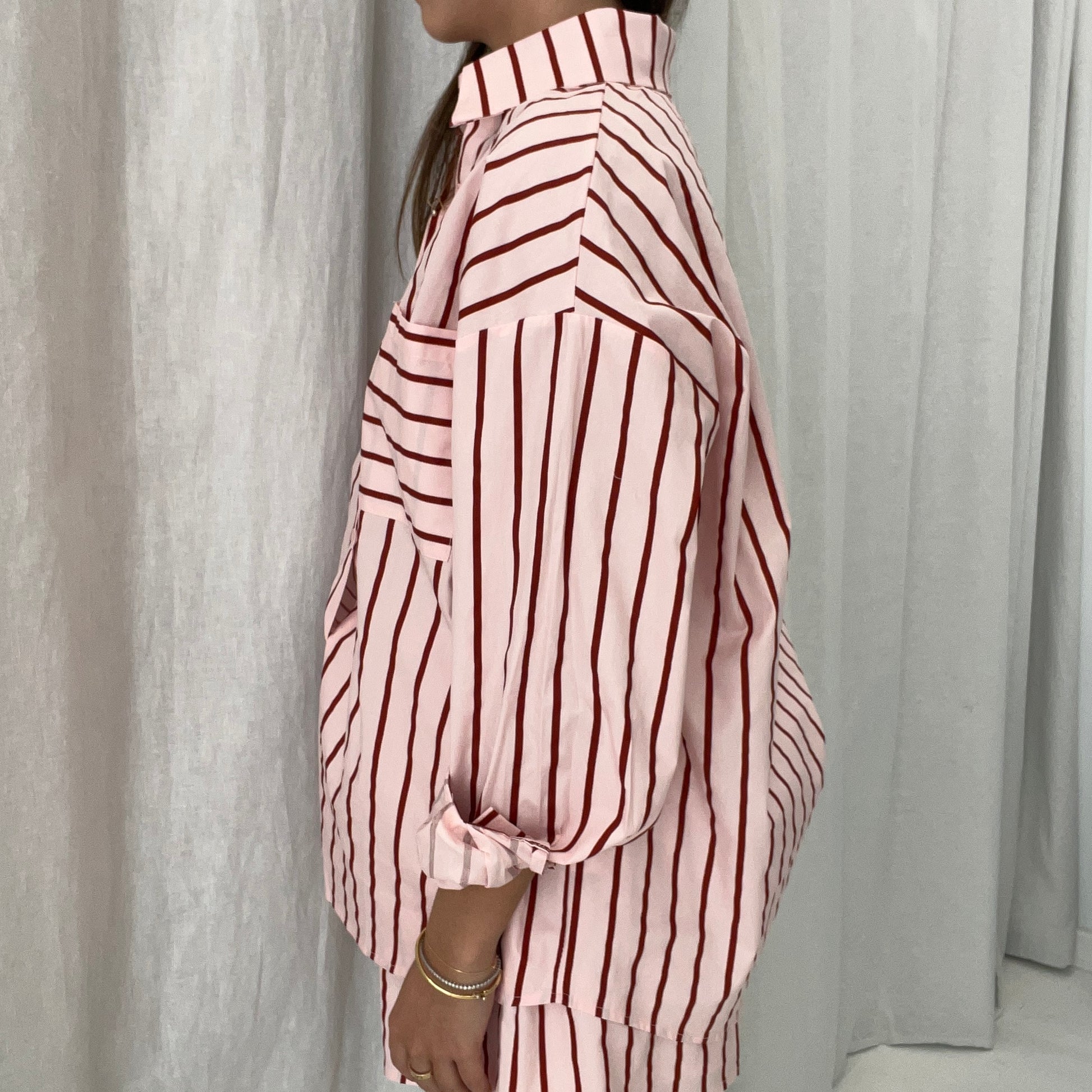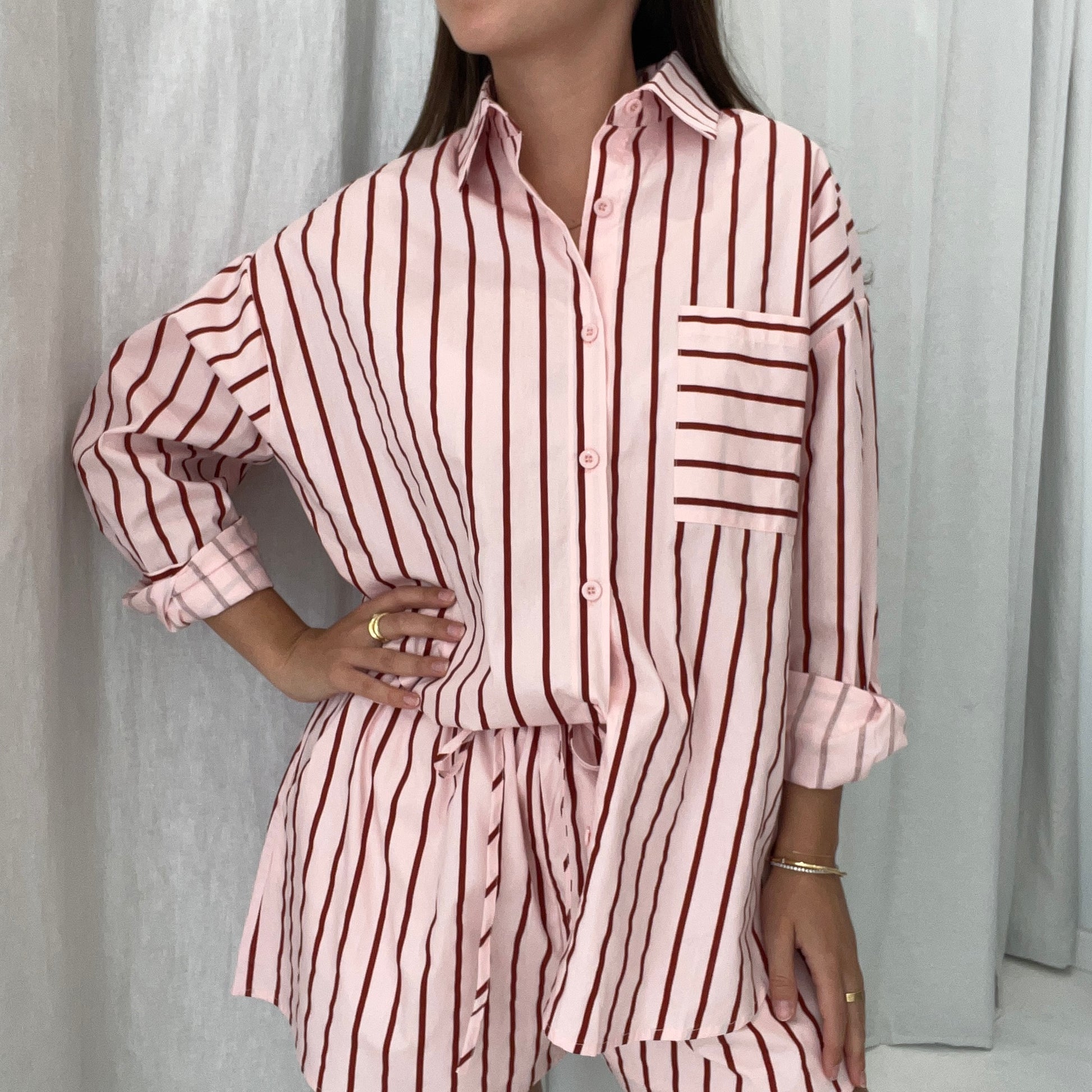 Effortless and modern, this co-ord top features a relaxed-fit, pink button-up shirt with burgundy pinstripes and a contrasting striped chest pocket. Pair it with the Charlie Shorts!