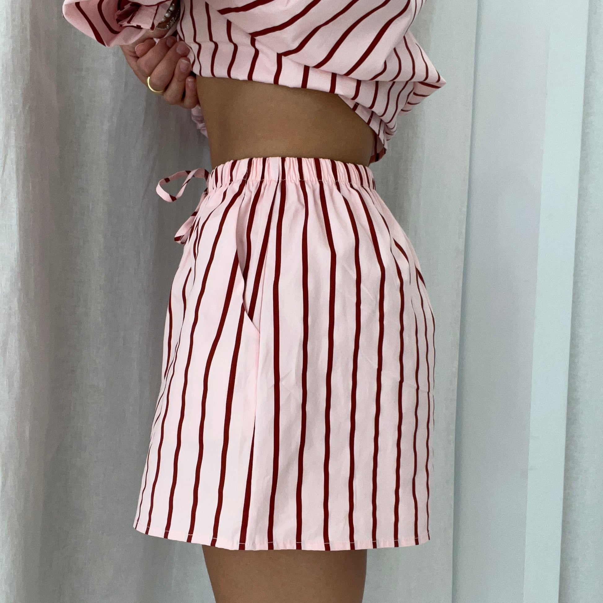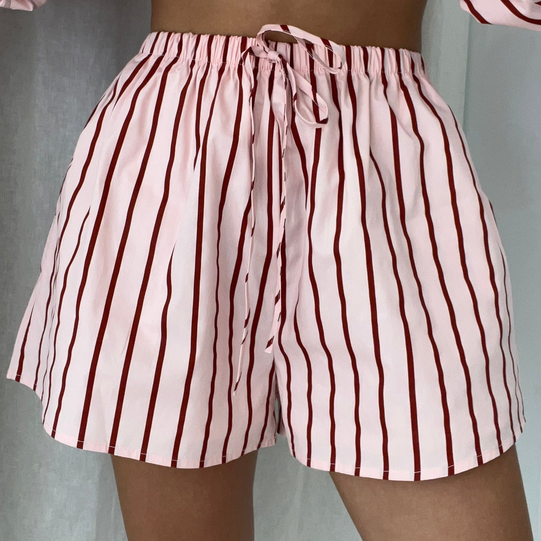 These pink shorts feature a subtle vertical pinstripe pattern in burgundy, offering a tailored yet relaxed silhouette. Designed with a comfortable elastic waistband and a slightly loose fit, they’re perfect for effortless styling- whether paired with the matching shirt or worn solo for a casual-chic look.