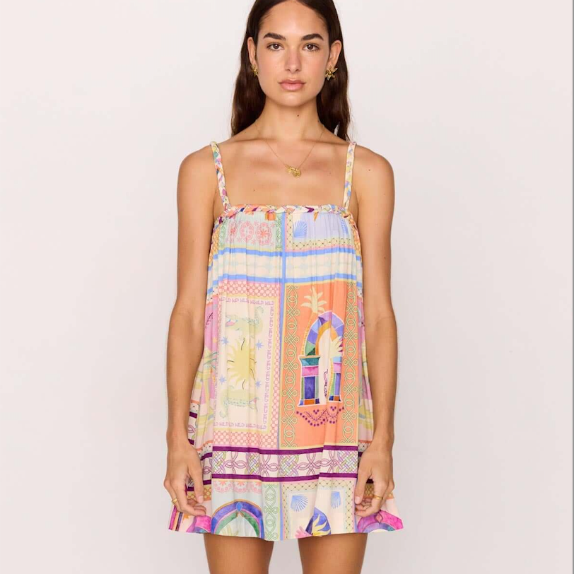 The Elysia Babydoll Mini Dress in Multicolour Print is a playful summer staple with a vibrant, tile-inspired print that feels straight out of a Mediterranean escape. Featuring a relaxed babydoll silhouette, adjustable straps, and a breezy mini length, this dress is perfect for throwing on over swimwear or styling with sandals for an effortless day-to-night look.