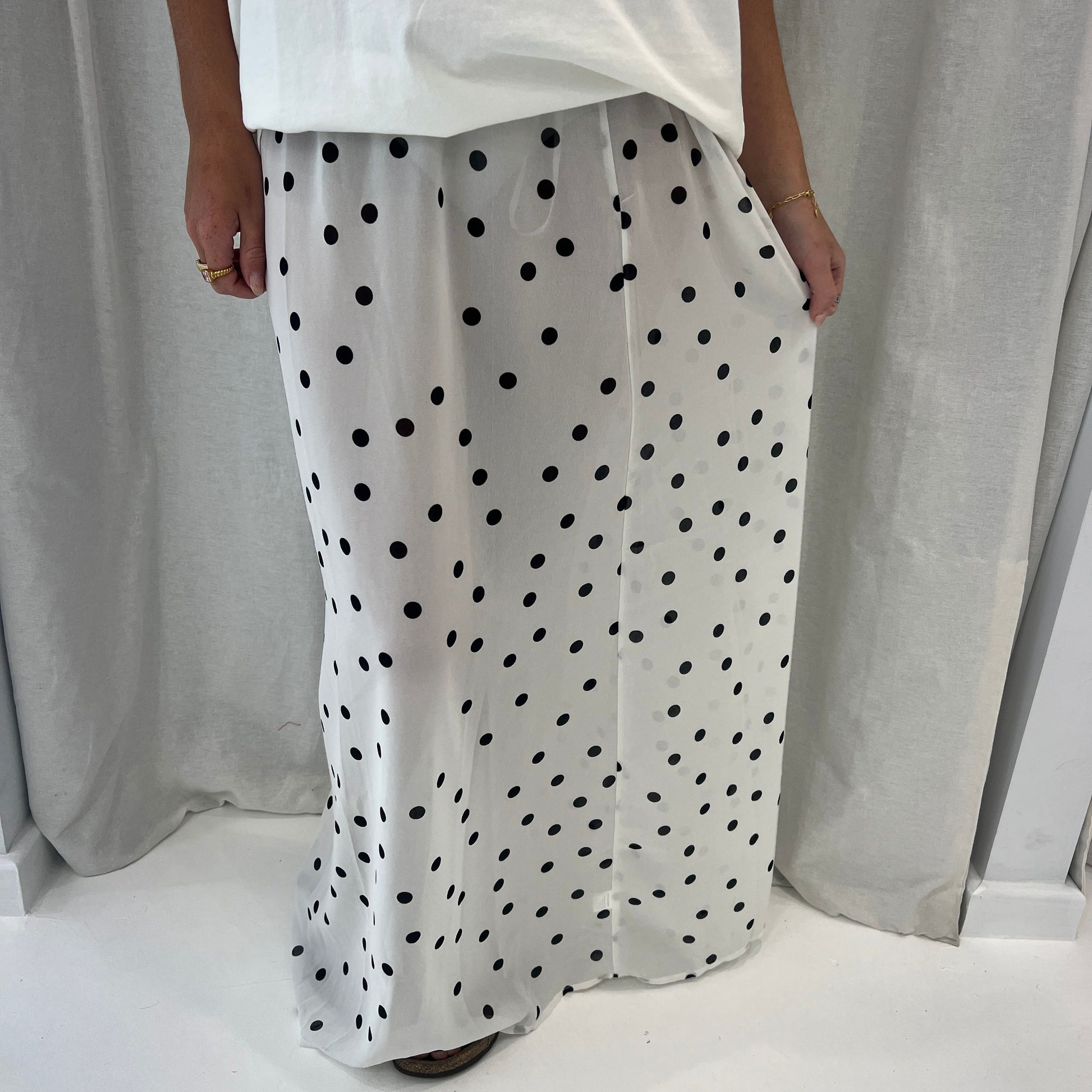 This super cute polka dot maxi skirt, has a sheer breathable fabrication.