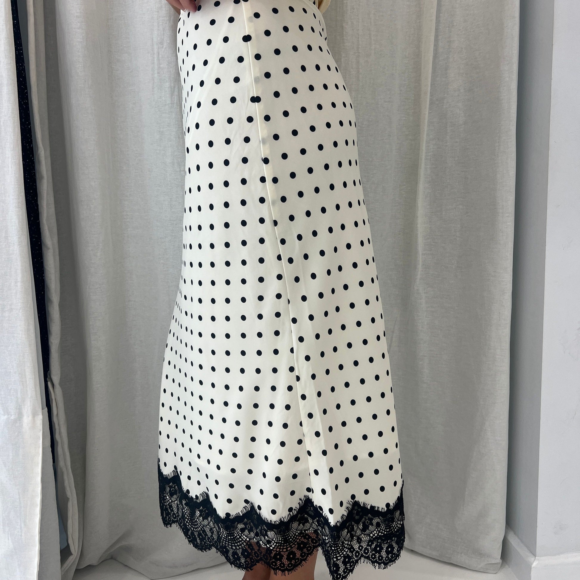 The Mary skirt is a silk like skirt with black dolka dots over a white background, with lace detailing down the bottom. Features an elastic waistband and a hidden size zipper