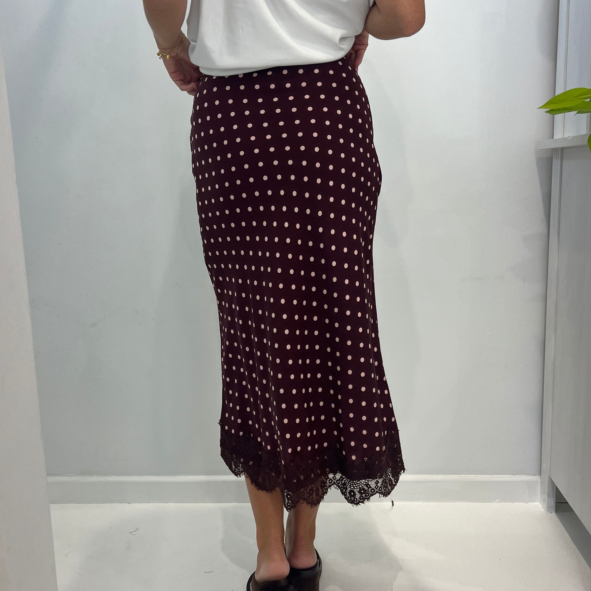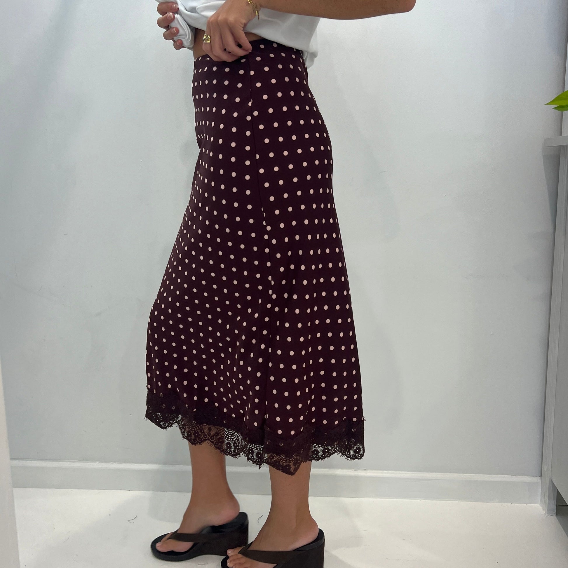 The Mary skirt is a silk like skirt with pink dolka dots over a burgundy background, with lace detailing down the bottom. Features an elastic waistband and a hidden size zipper