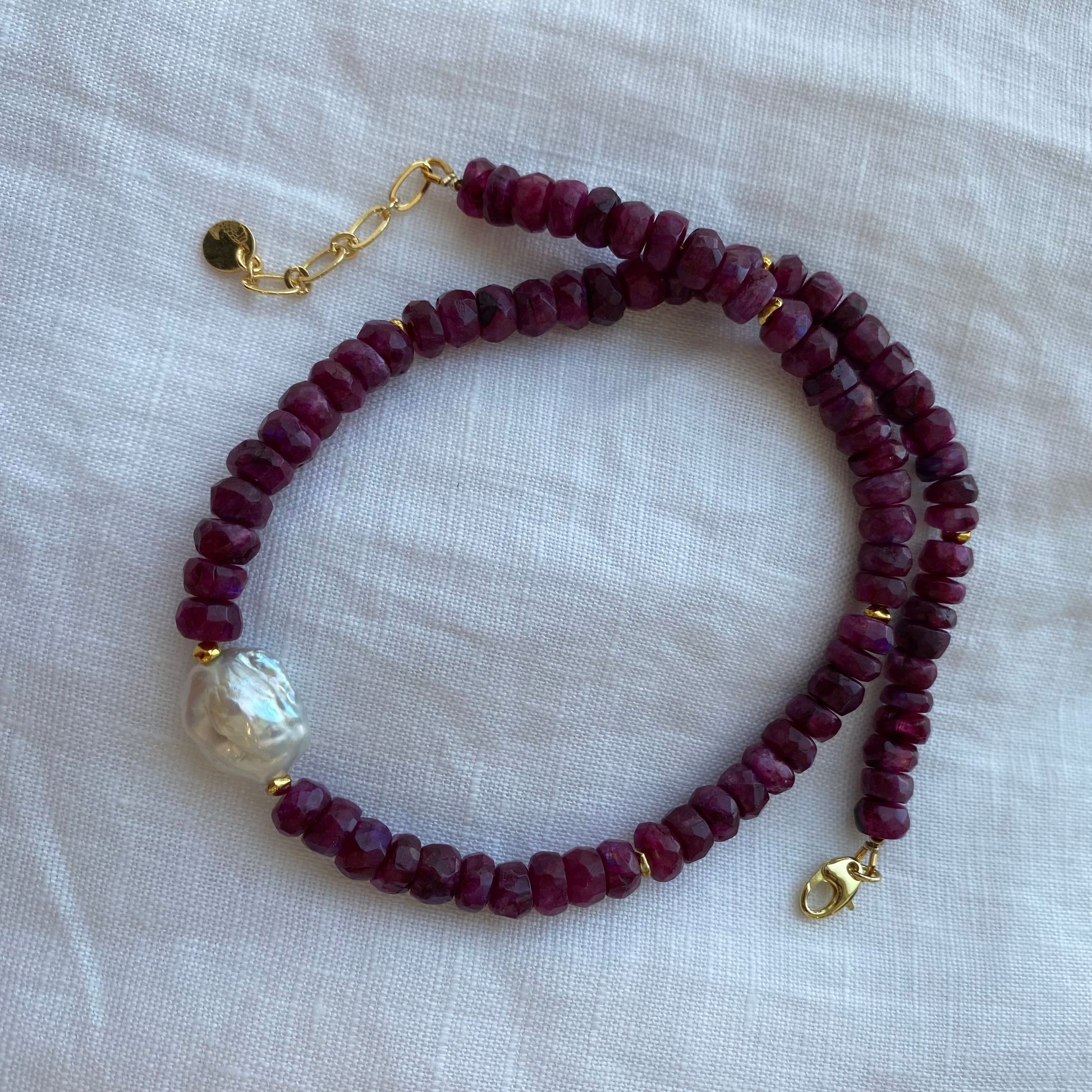 The scarlet necklace is made from natural rubies, featuring a keshi pearl.