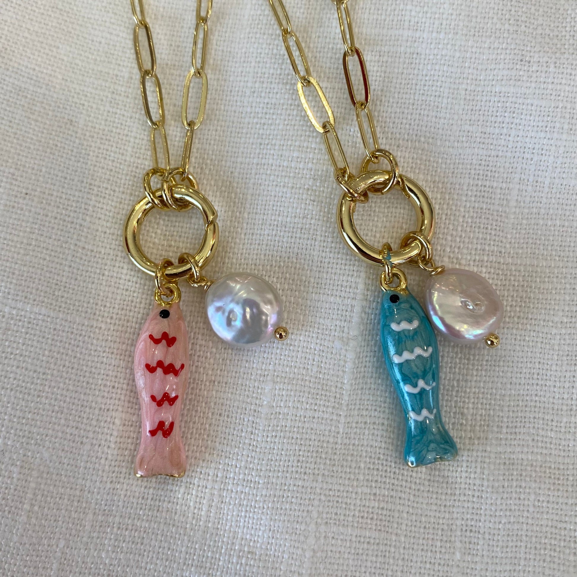 18k gold plating over brass. Fish pendant made out of enamel. Freshwater Pearl
