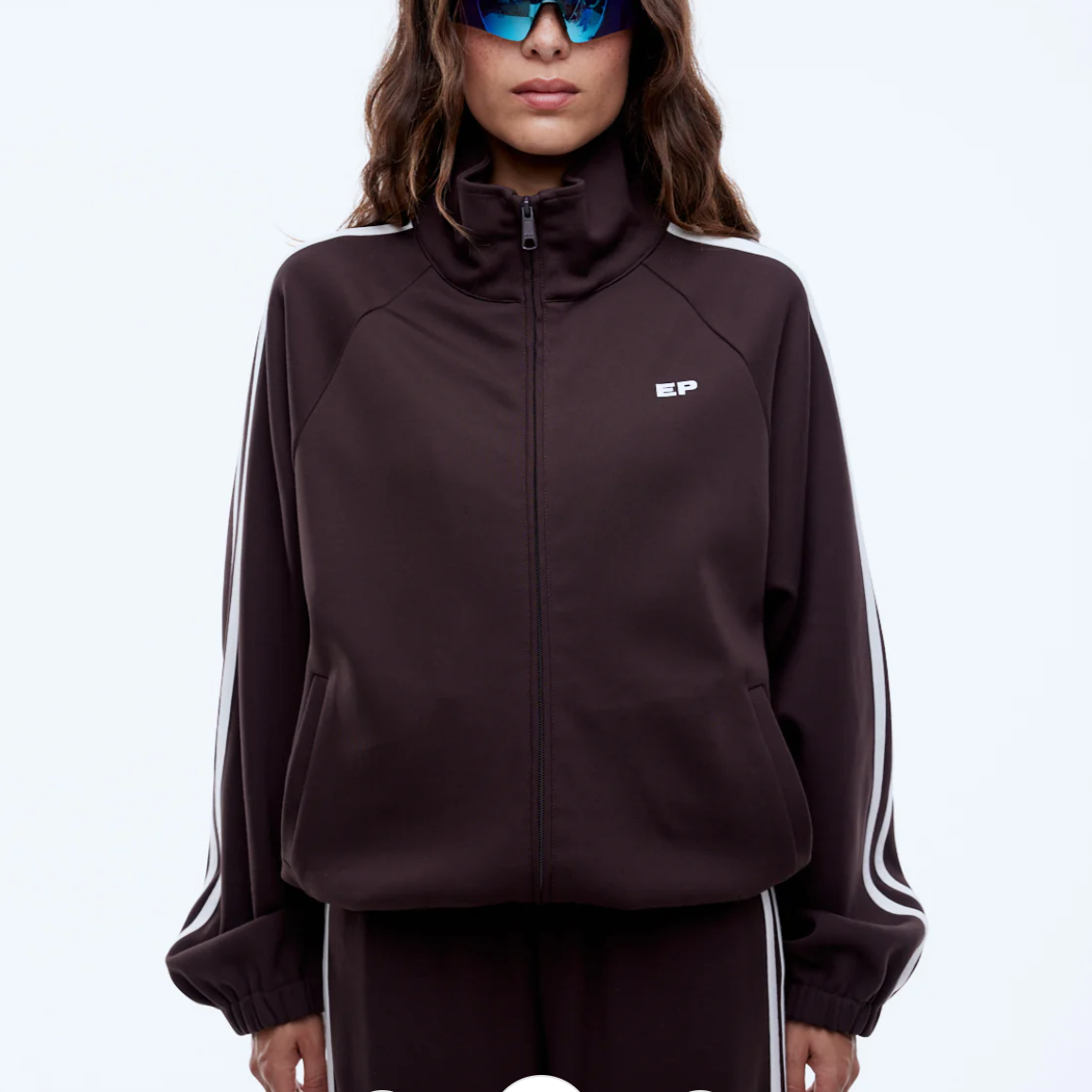 The Valentina Zip Thru is crafted in a smooth rayon blend with a relaxed, sporty silhouette, finished in cocoa for an elevated everyday layer. Designed with a two-way zip, raglan sleeves and contrast sleeve stripe detailing, it features elasticated cuffs and an adjustable hem with drawcord toggles to wear loose or cinched. Welt pockets and stacked Ena Pelly logo prints complete the confident, street ready feel.